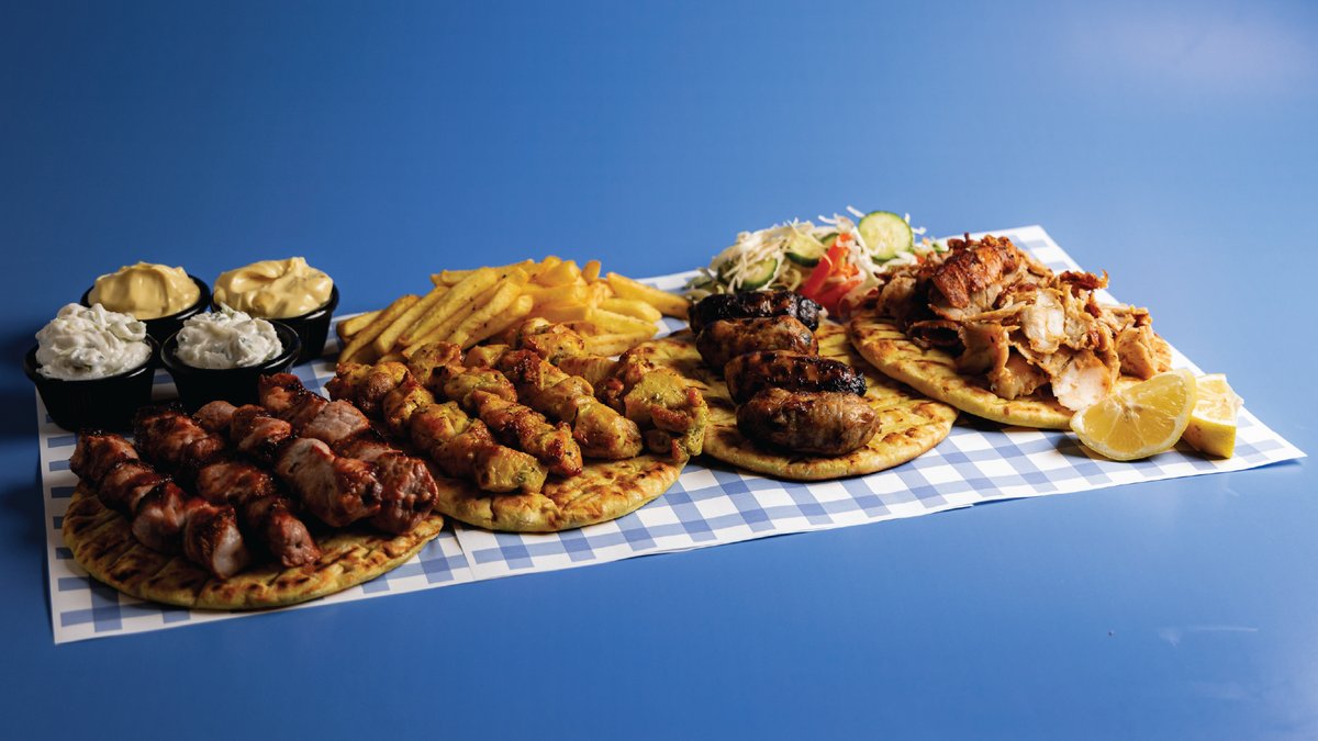 2 pork and 2 chicken souvlaki, 2 sheftalia, pork and chicken gyros, 2 portions of French fries, mix salad, 2 Greek corn or Cyprus pitas and 2 dips of your choice