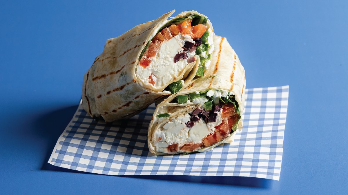 Tortilla wrap with chicken gyros, lettuce, tomato, olives and feta cheese