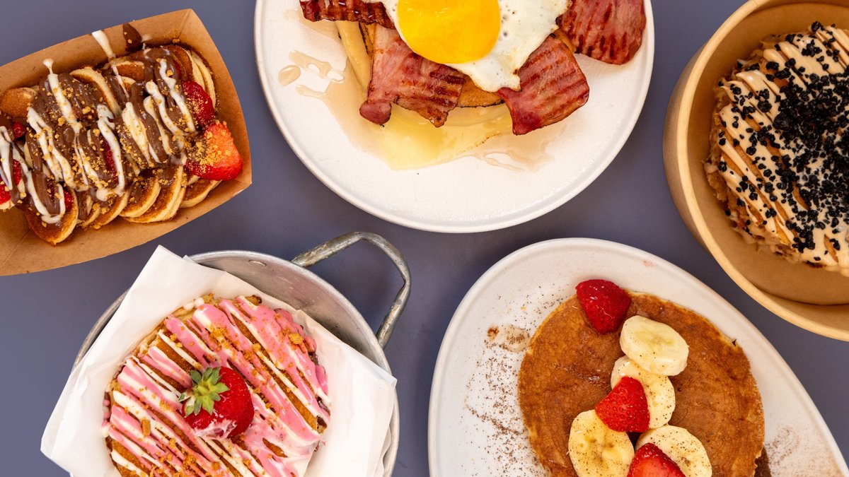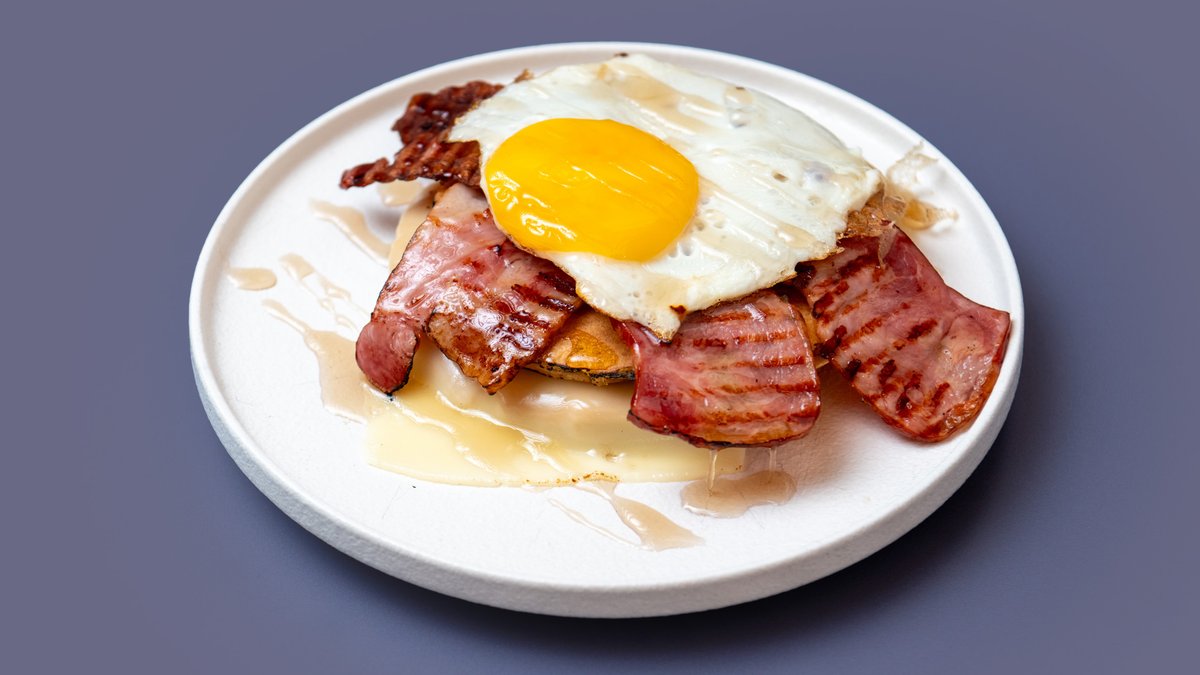 Αλμυρά pancakes με αυγό, μπέικον και dressing μελιού, σιροπιού