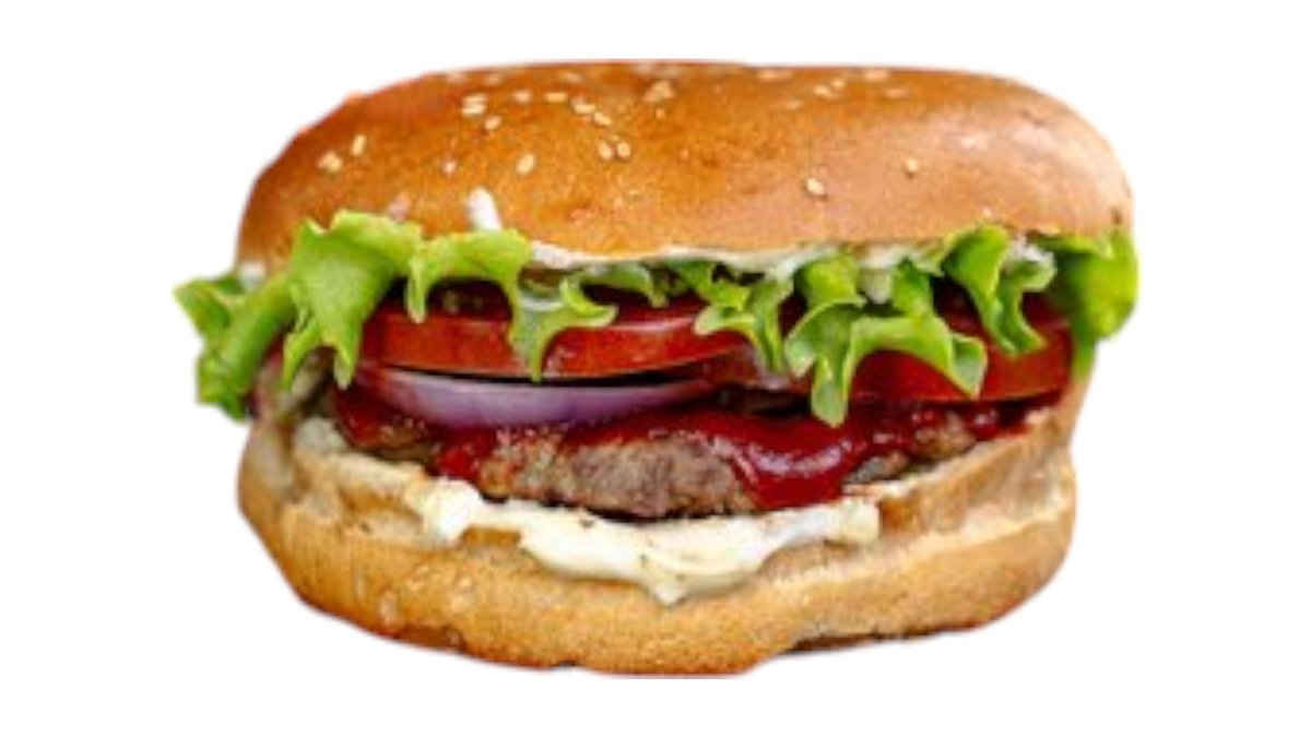 200гр - говядина, помидор, огурец, лист салата, майонез, кетчуп
