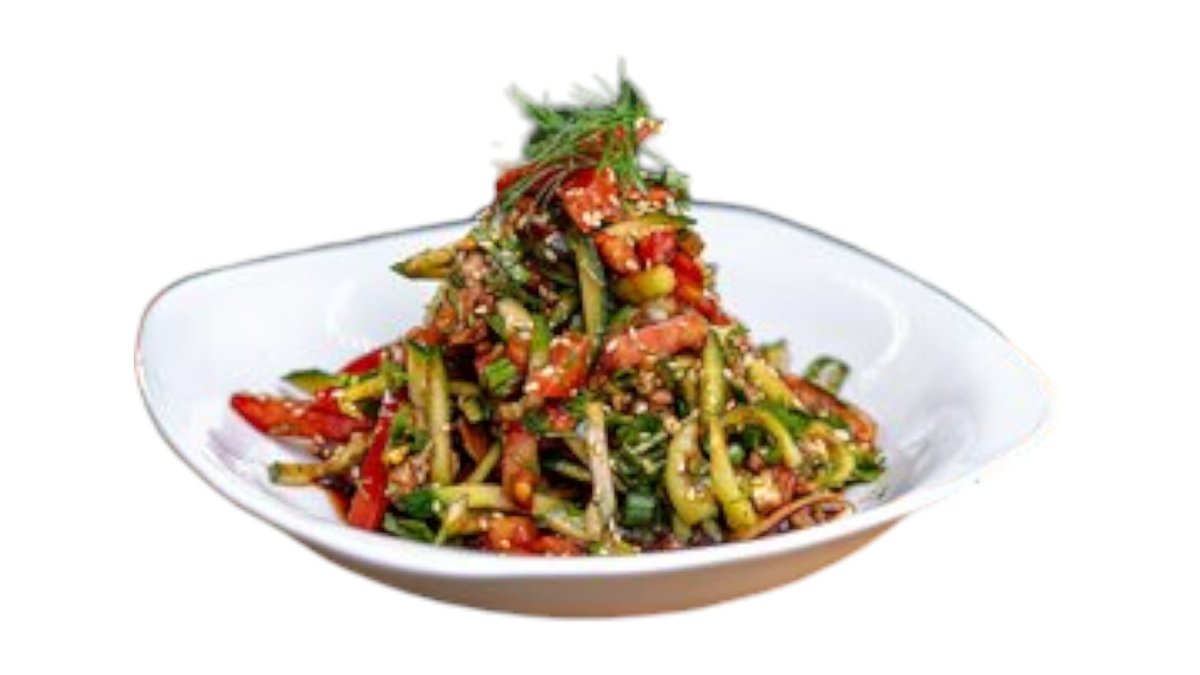 250гр - огурец, помидор, лук, кинза, соя, соль, перец, кунжут, болгарский перец, чили-соус