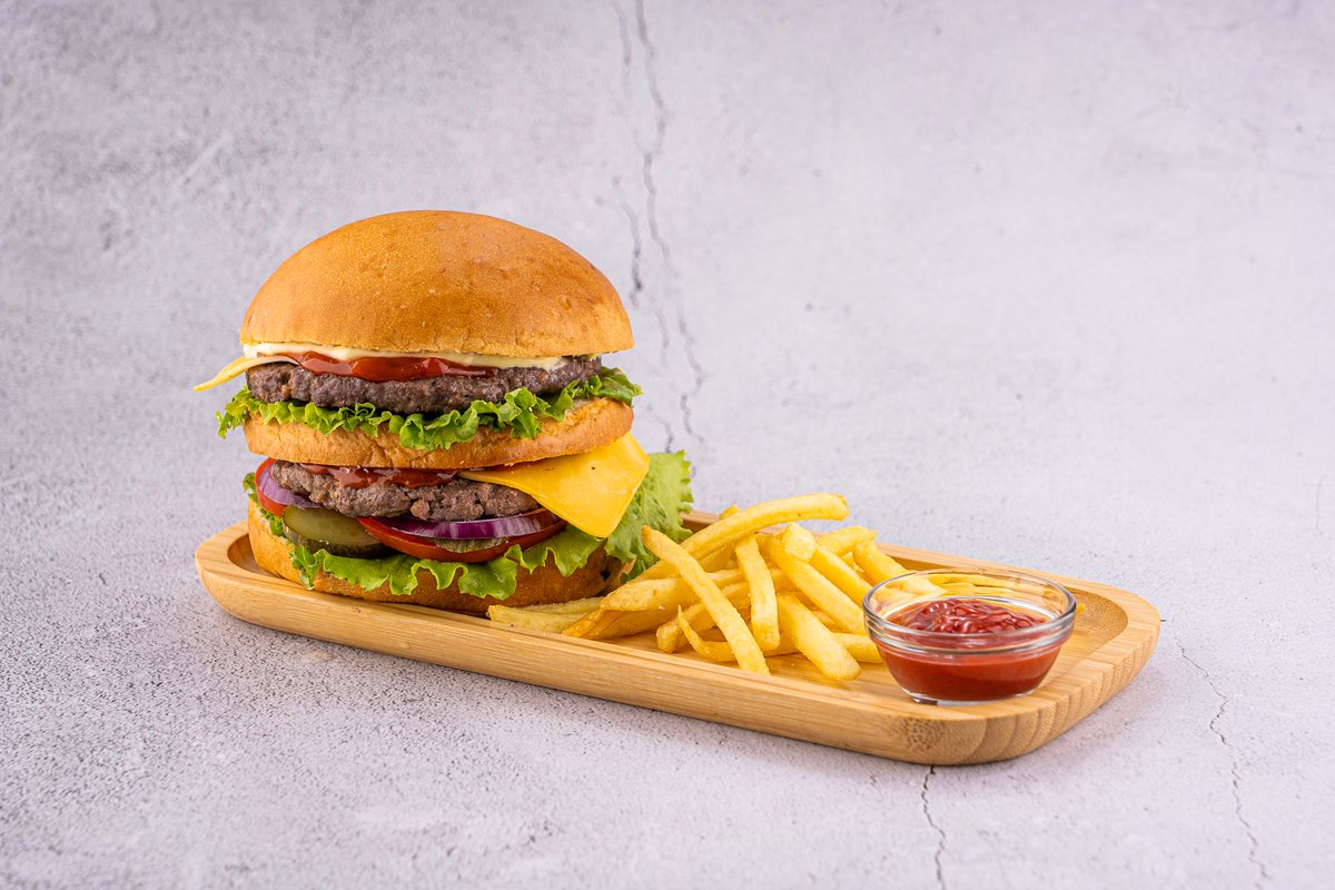 540гр булочка, говяжья котлета, помидор, огурцы, айсберг, соус, фри, кетчуп