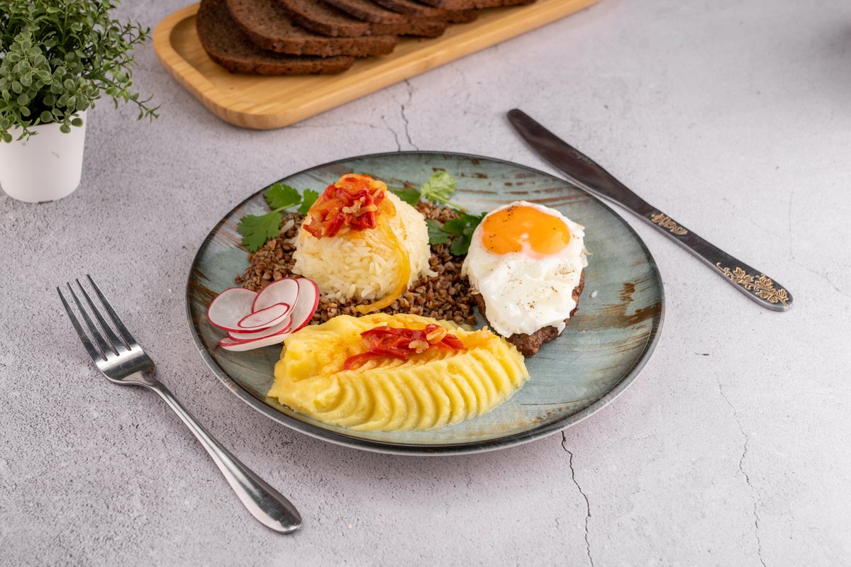 450гр гречка, пюре , рис , котлета 1шт, яйцо 1шт