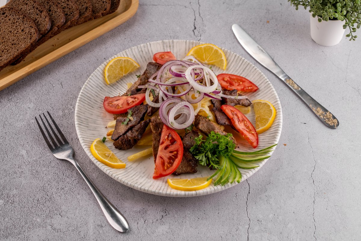 460гр говяжья вырезка,фри, помидор, огурцы, лук, лимон