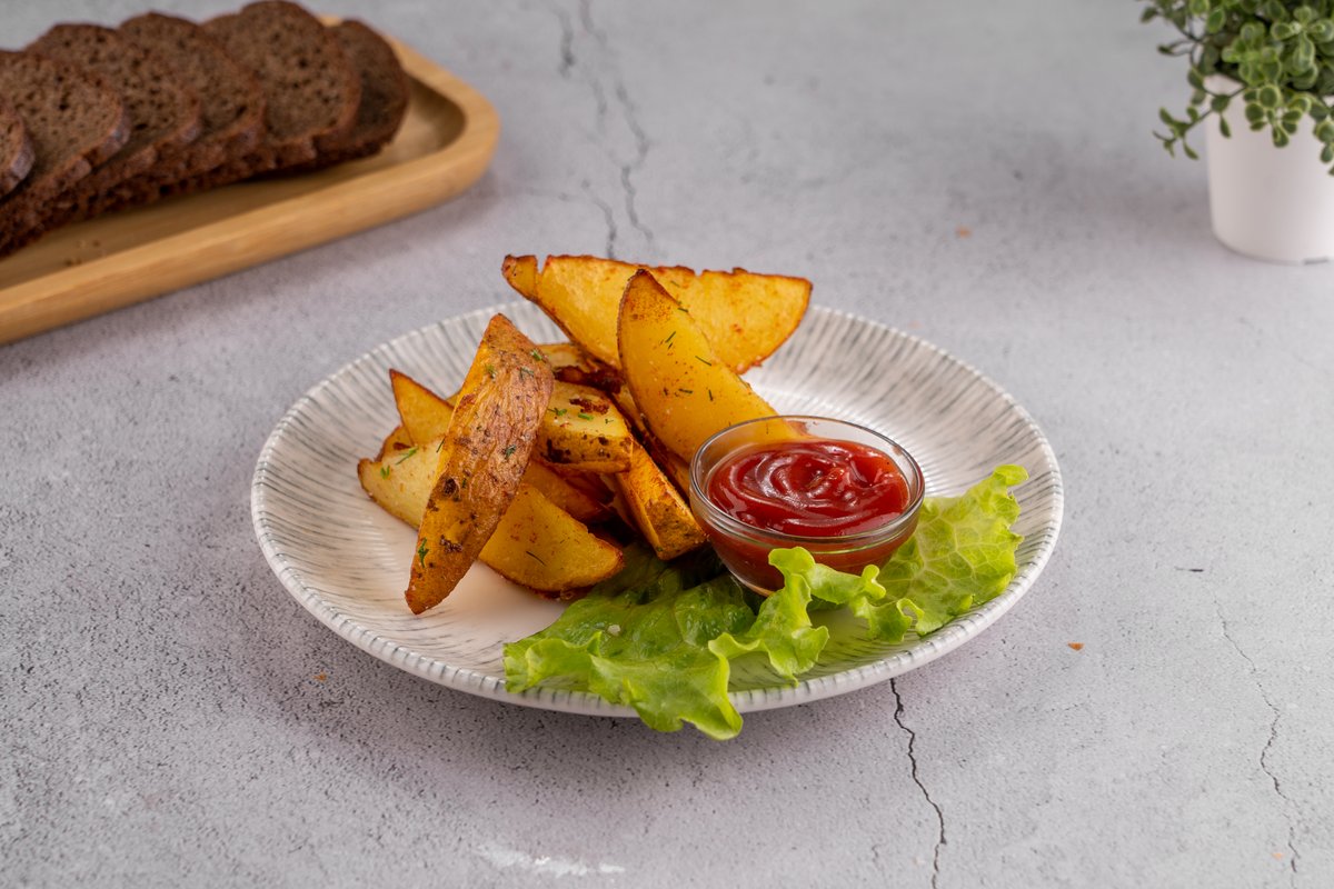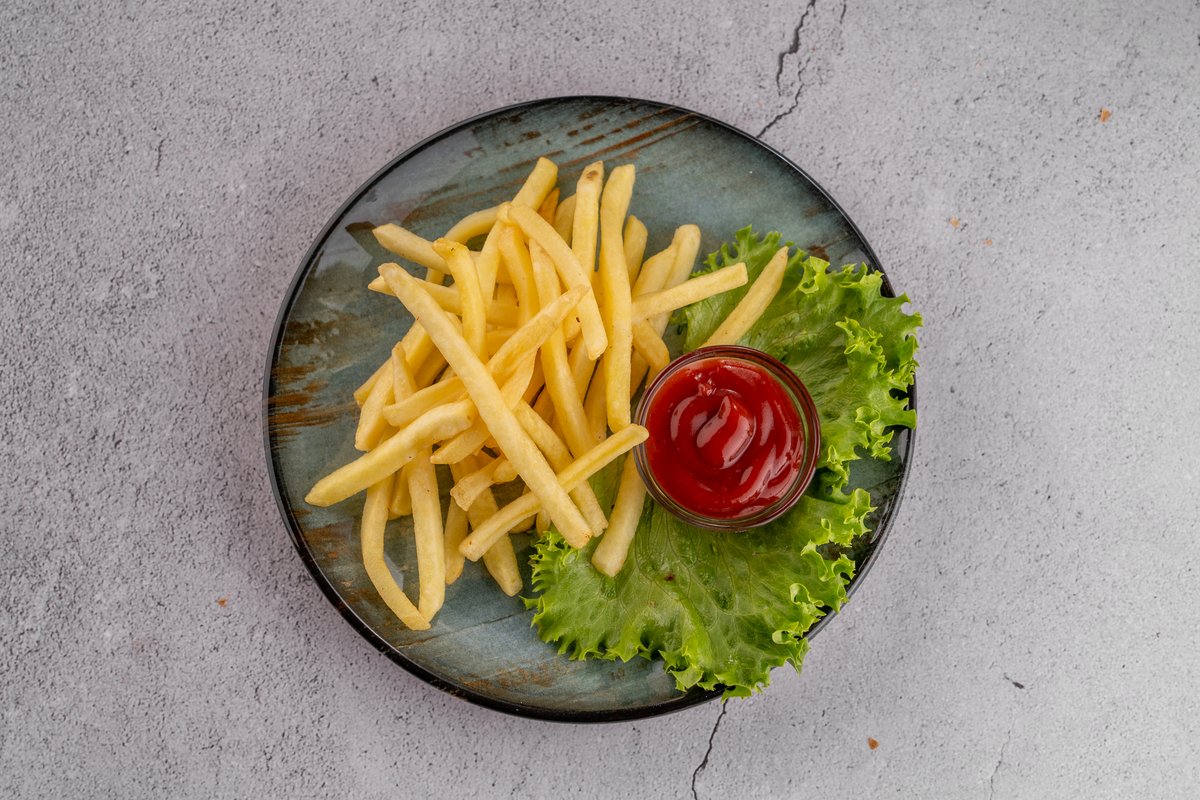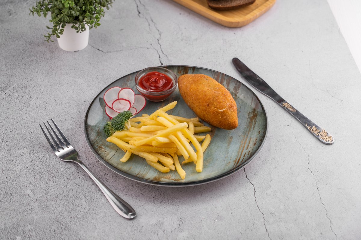350гр Куриная грудка, масло сливочное, фри, кетчуп