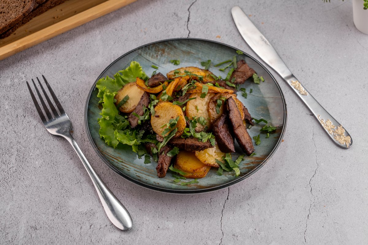 350гр говяжья вырезка, лук, картошка,