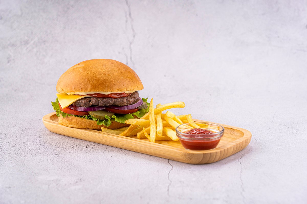 350гр булочка, говяжья котлета, помидор, огурцы, айсберг, соус, сыр, фри, кетчуп