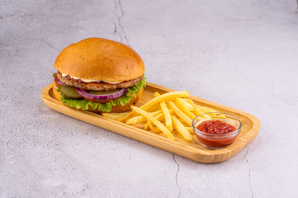 510гр булочка, говяжья и куриная котлета, помидор, огурцы, айсберг, соус, фри , кетчуп
