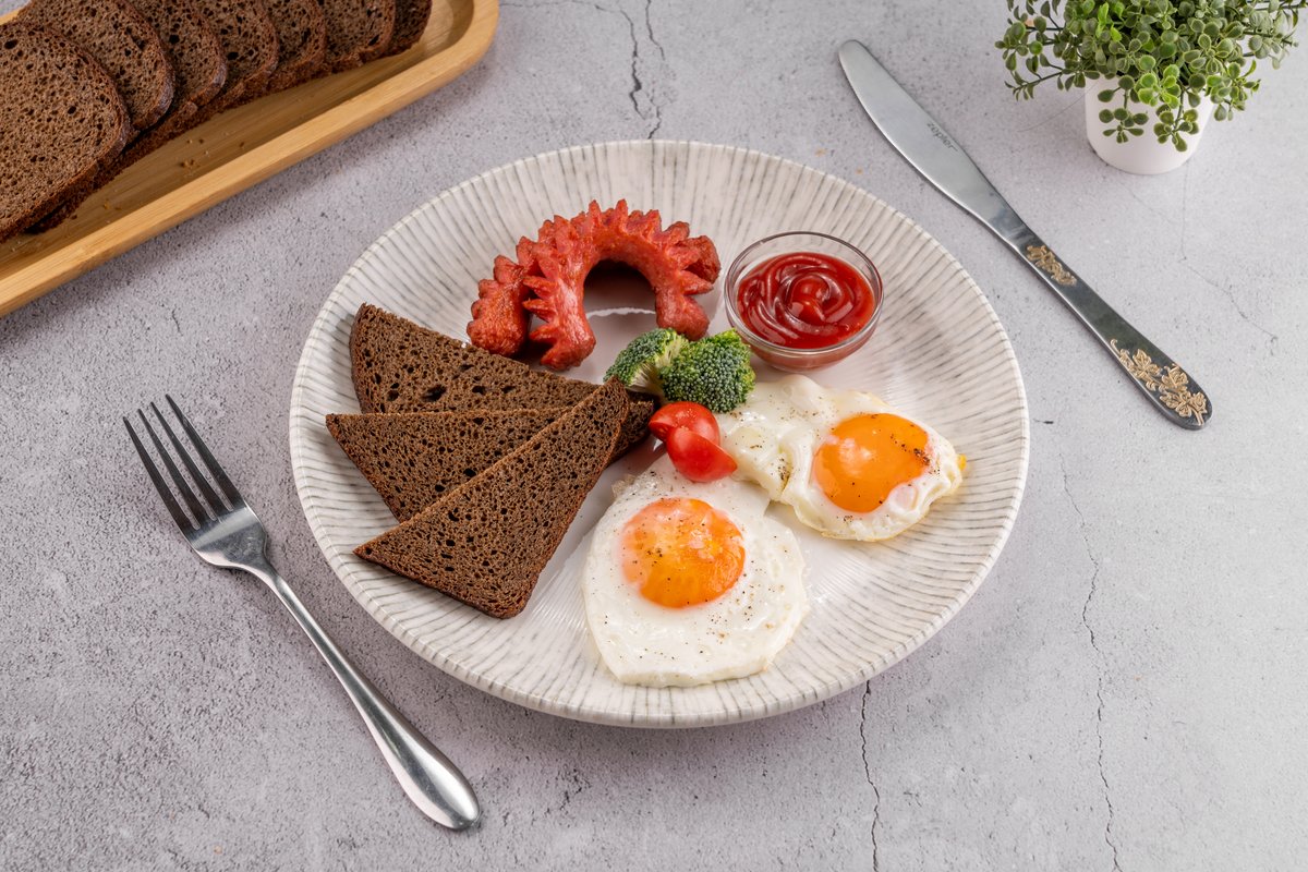 350гр Сосиски 2шт , яйцо 2шт , кетчуп , хлеб