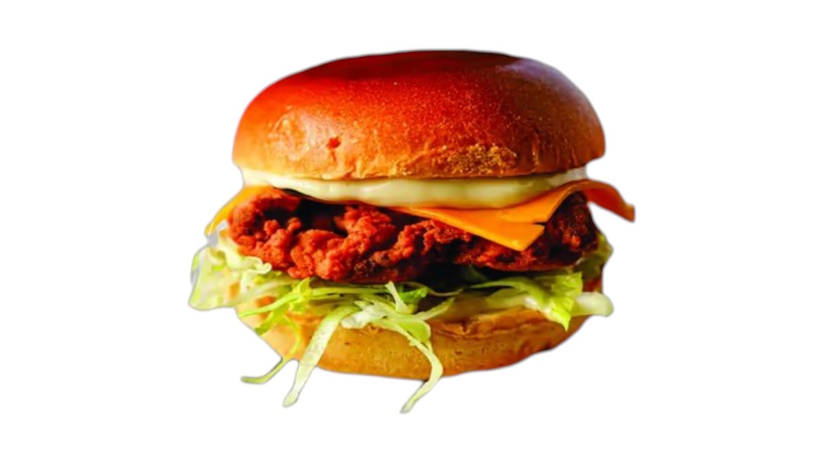 Куриное филе, сыр, бургер-соус, салат айсберг, маринованные огурцы, свежий ломтик помидора и красный лук.