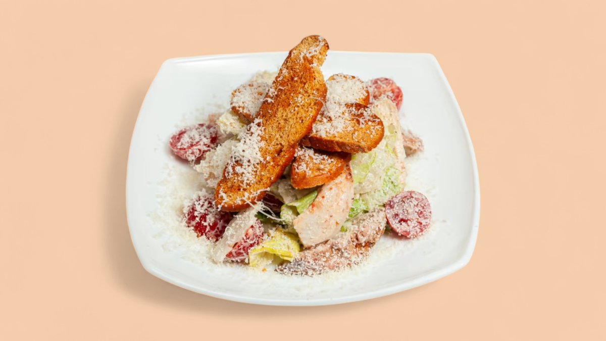 Куриное филе, айсберг, черри, гренки, сыр пармезан, соус цезарь