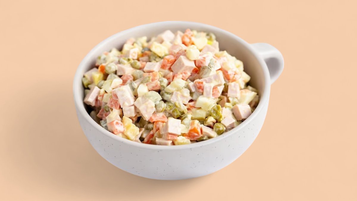 Говядина, картофель, морковь, огурец, зеленый горошек, яйцо, майонез