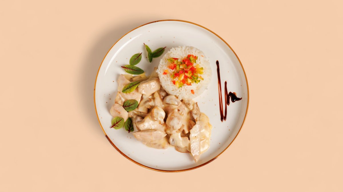 Курица,грудинка, шампиньоны,сливки,сыр гауда,рис
