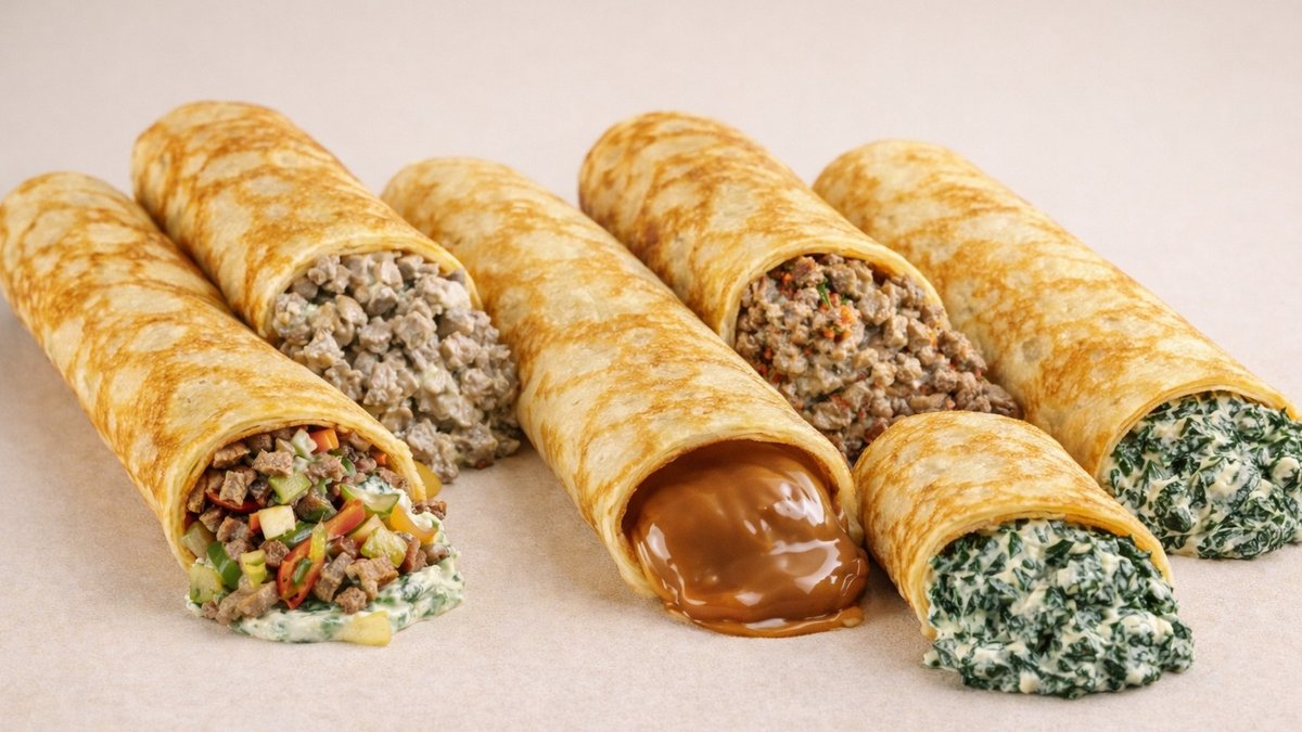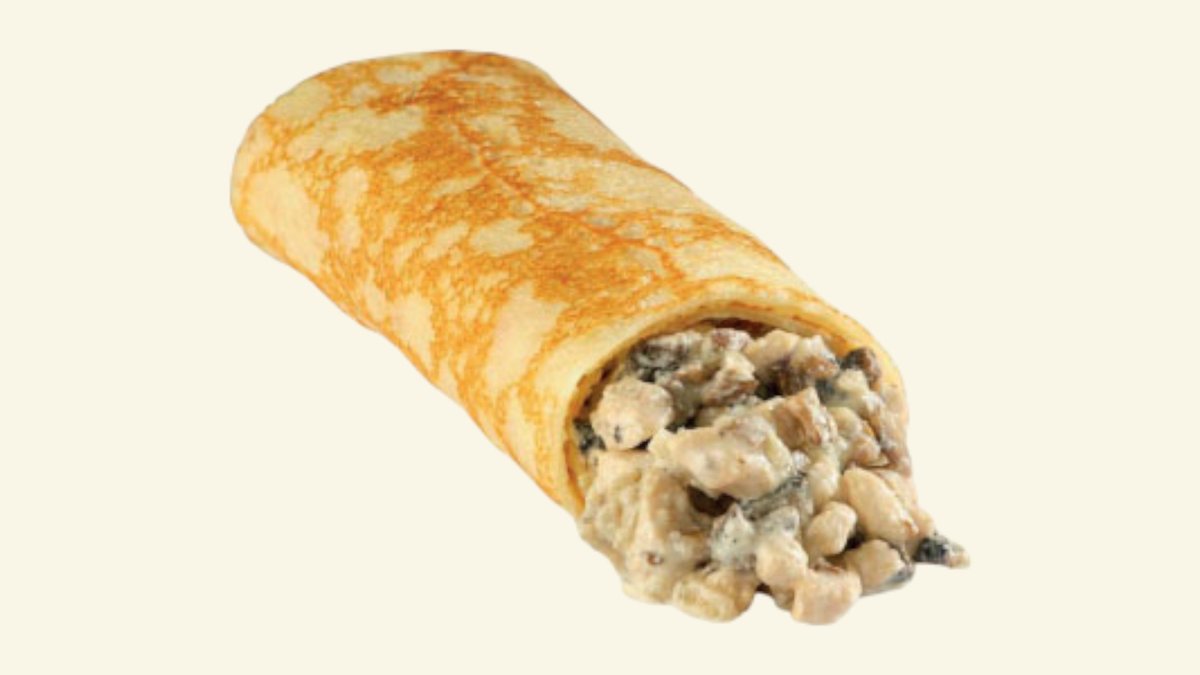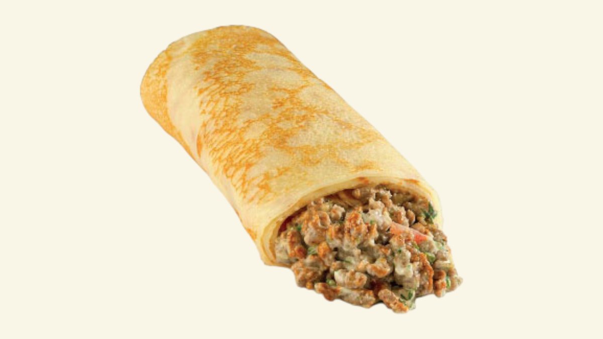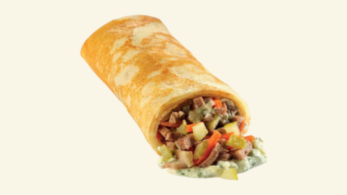 Большой блин с маслом, фарш из говядины и курицы, обжаренный с луком и специями, помидор, огуречно-чесночный соус «Тартар»