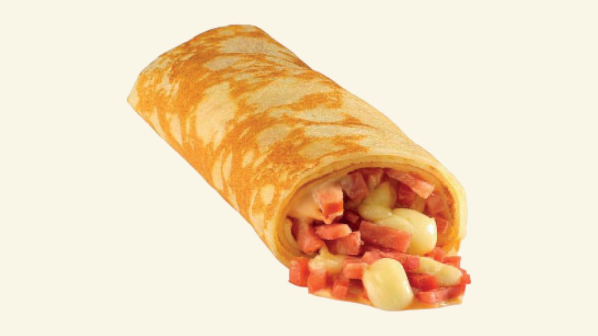 Большой блин с маслом, ветчина из говядины, тёртый сыр, майонез и томатный соус