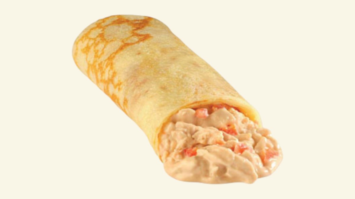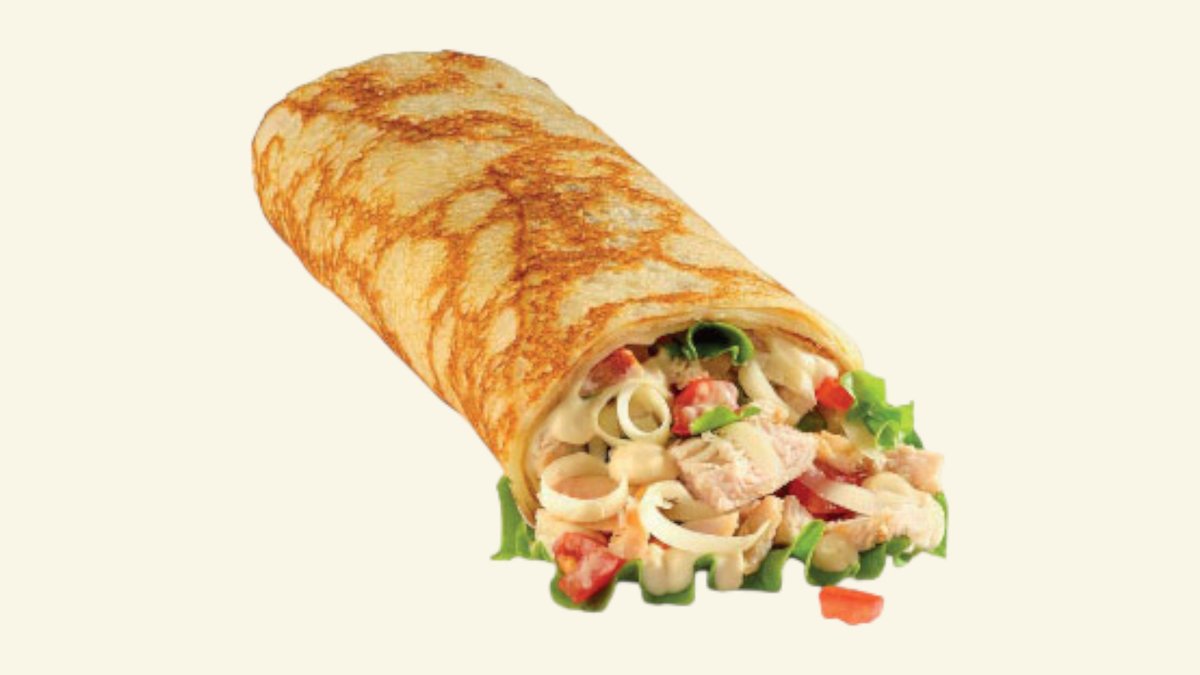 Большой блин с маслом, запечённая куриная грудка, сыр моцарелла, помидоры, салат айсберг, соус