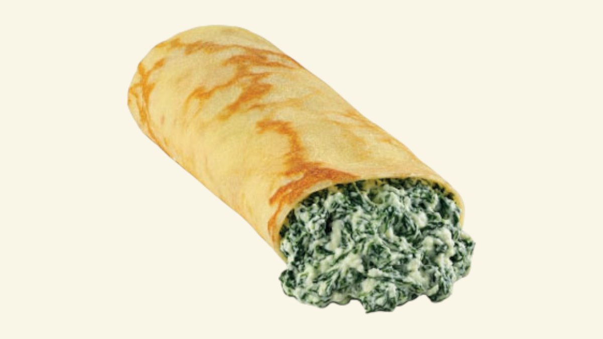 Большой блин с маслом, листья шпината с обжаренным луком и творожным сыром