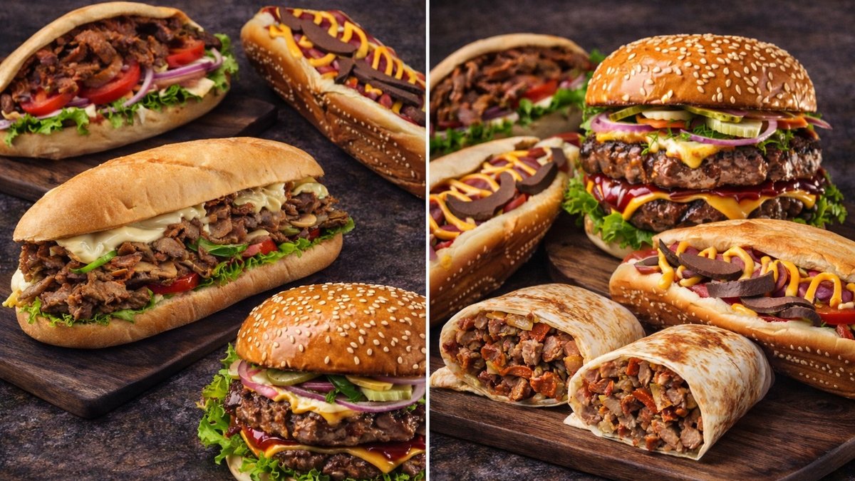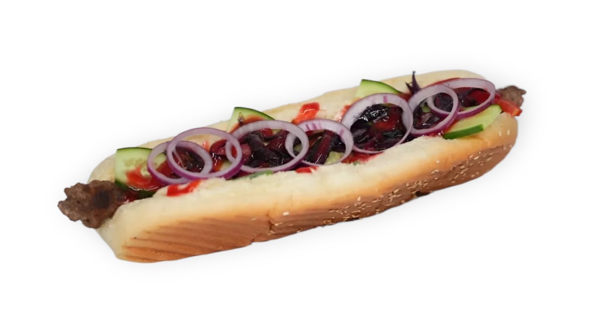 2 dona sosiska, qazi, bodring, pamidor, moyanez, ketchup, preslangan go’sht
