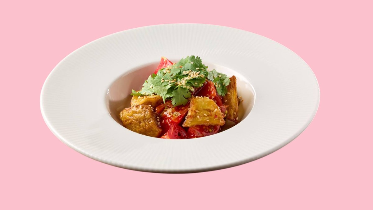 Томаты, баклажан, соус азиатский.