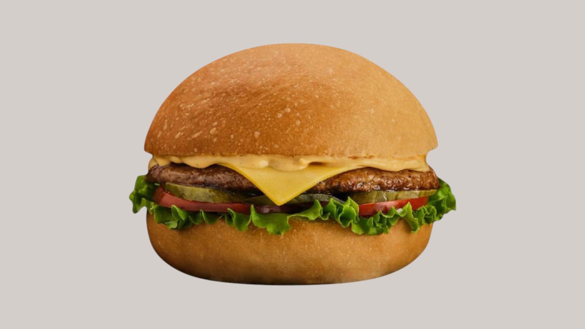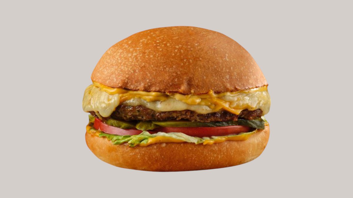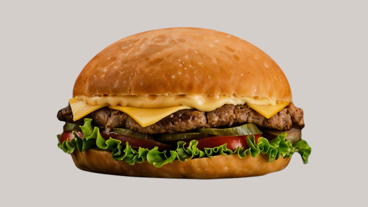 Говяжая котлета обжаренная на барбекю, хрустящая булочка, лист айсберг,свежие помидоры, красный лук, фирменный бургер соус с солёными огурцами,сыр Чеддар и сыр моцарелла тающая