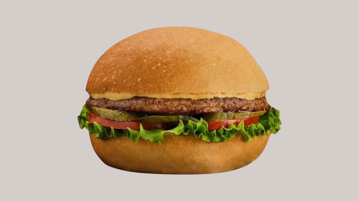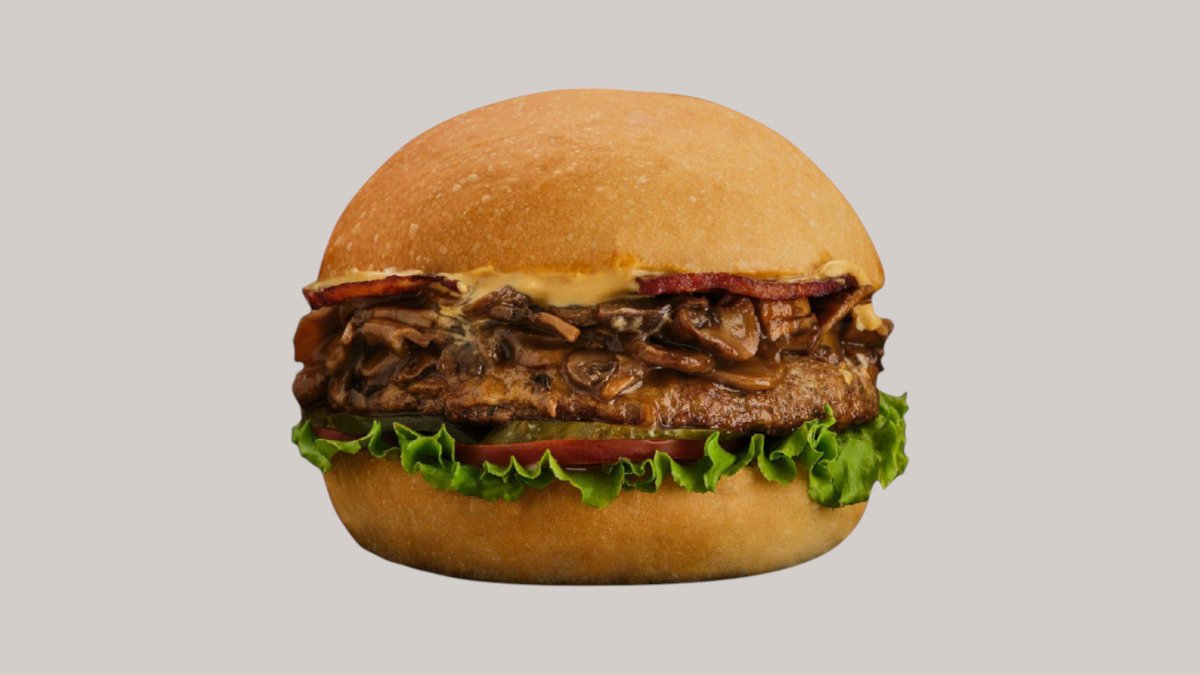 Говяжая котлета обжаренная на барбекю, хрустящая булочка, лист айсберг,свежие помидоры, красный лук, фирменный бургер соус с солёными огурцами, слегка обжаренные свежие шампиньоны