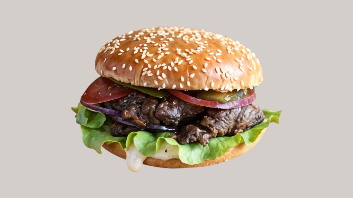 Говяжий стейк бонфиле обжаренная на барбекю, хрустящая булочка, лист айсберг,свежие помидоры, красный лук, фирменный бургер соус с солёными огурцами