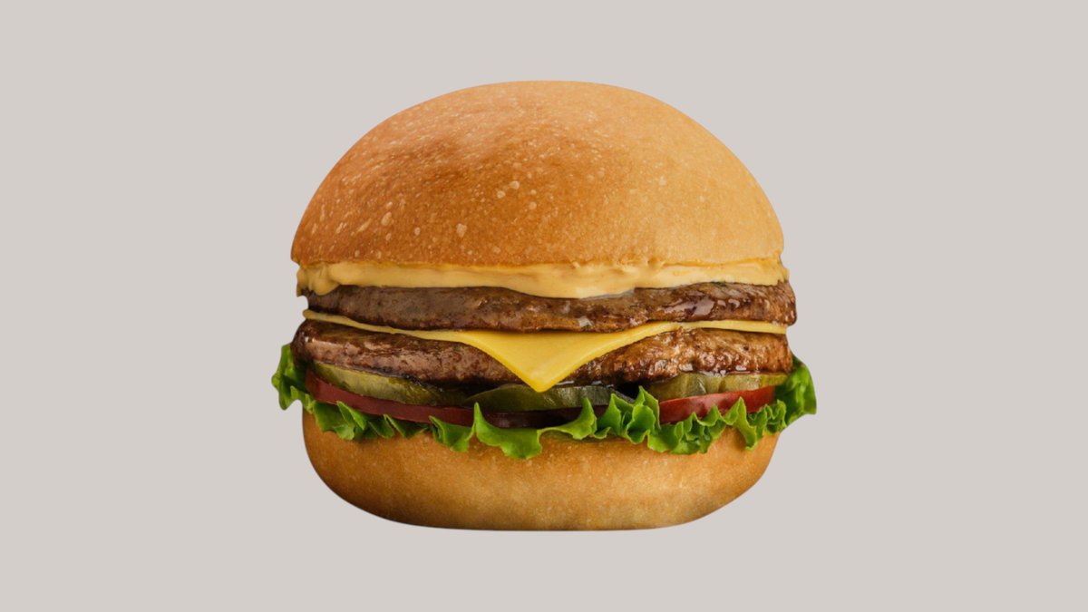 Говяжая котлета обжаренная на барбекю 2шт, хрустящая булочка, лист айсберг,свежие помидоры, красный лук, фирменный бургер соус с солёными огурцами ,сыр Чеддар