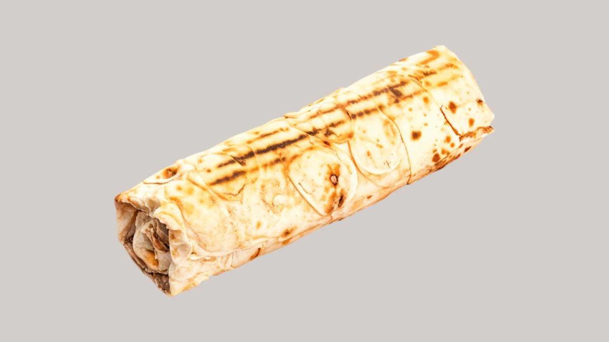 Говяжье мясо на вертеле,сыр чеддер,картофельные чипсы,свежие помидоры,свежие огурцы,майонез и томатный соус заворачивается в тесто лаваша
