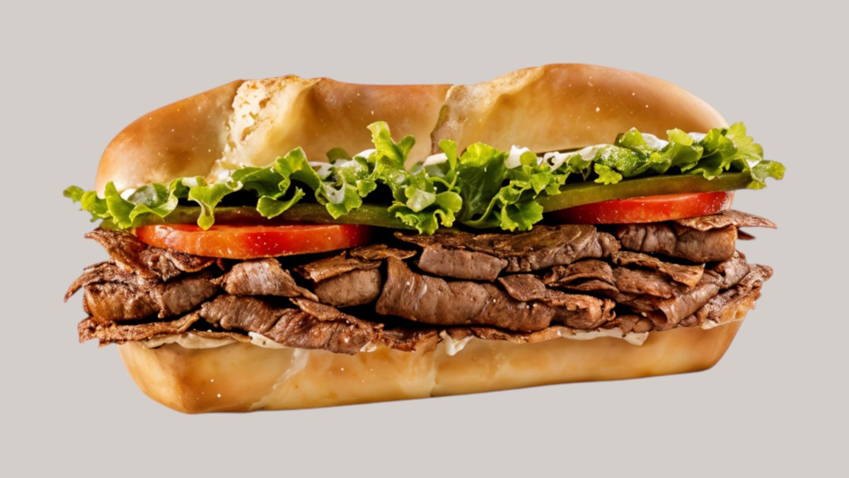 Говяжий стейк обжаренная на барбекю, хрустящий тост, лист айсберг,свежие помидоры,свежие огурцы,сыр чеддар,белый соус и картофель фри