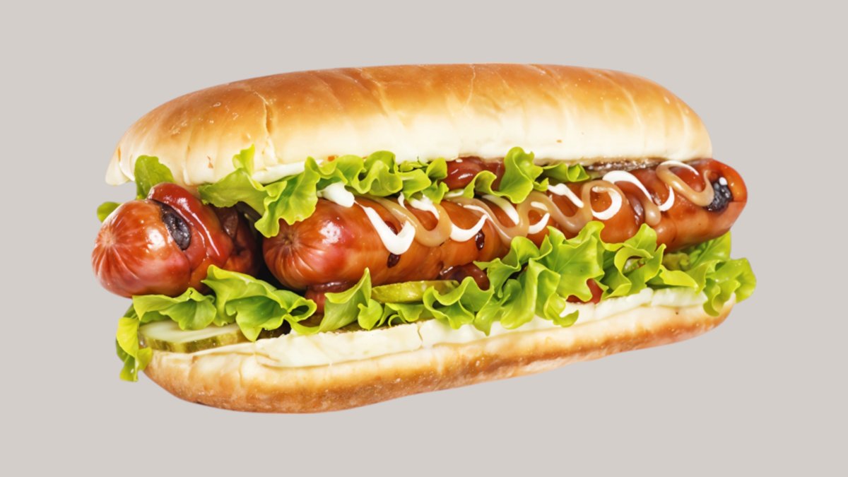 Хрустящая булочка,сосиска 2шт, лист айсберг,свежие помидоры,свежие огурцы,кетчуп и майонез