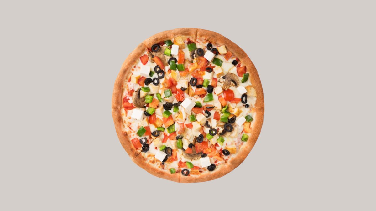 Тонкое тесто,фирменный соус для пиццы,сыр моцарелла,сыр фета,помидоры,болгарский перец,маслины, грибы шампиньоны