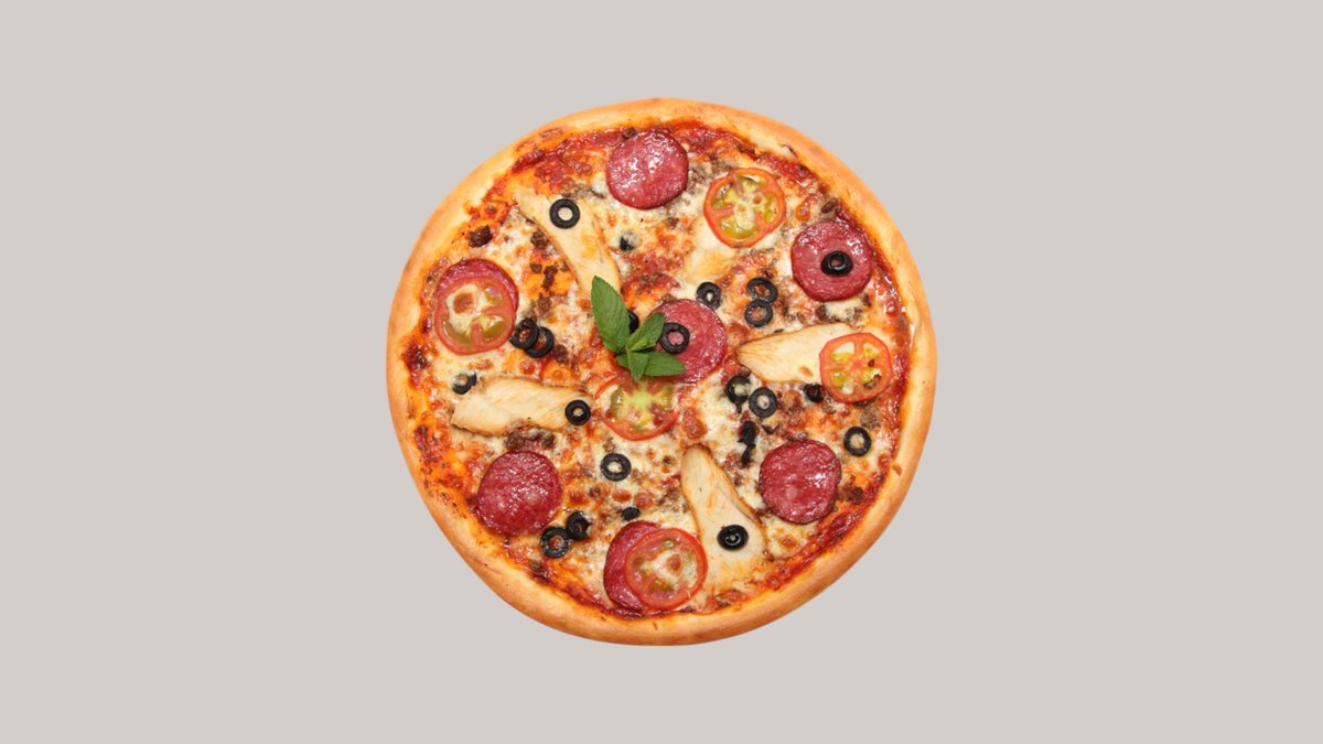 Тонкое тесто,фирменный соус для пиццы,сыр моцарелла,помидоры,болгарский перец,маслины, грибы шампиньоны,колбаса салями (халяль),куриное филе обжаренная на барбекю