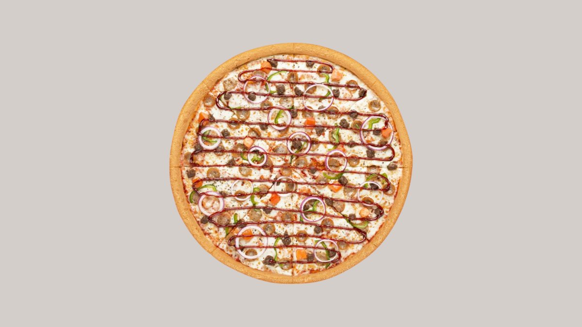 Тонкое тесто,фирменный соус для пиццы,соус чили,сыр моцарелла,помидоры,болгарский перец, грибы шампиньоны,халапеньо,говяжая и куриная мясо обжаренная на барбекю,лук шалот.