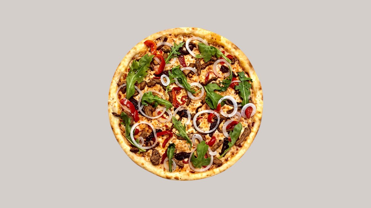 Тонкое тесто,фирменный соус для пиццы,сыр моцарелла,помидоры,болгарский перец,маслины, грибы шампиньоны,говяжий филе обжаренная на барбекю,лук шалот,руккола.