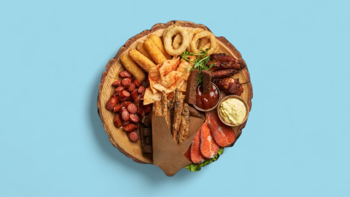 500гр Гарлики, говяжьи колбаски BBQ, сырные палочки в панировке, куриные крылья BBQ, луковқе кольца, мойва, форель х/к, тар тар, BBQ