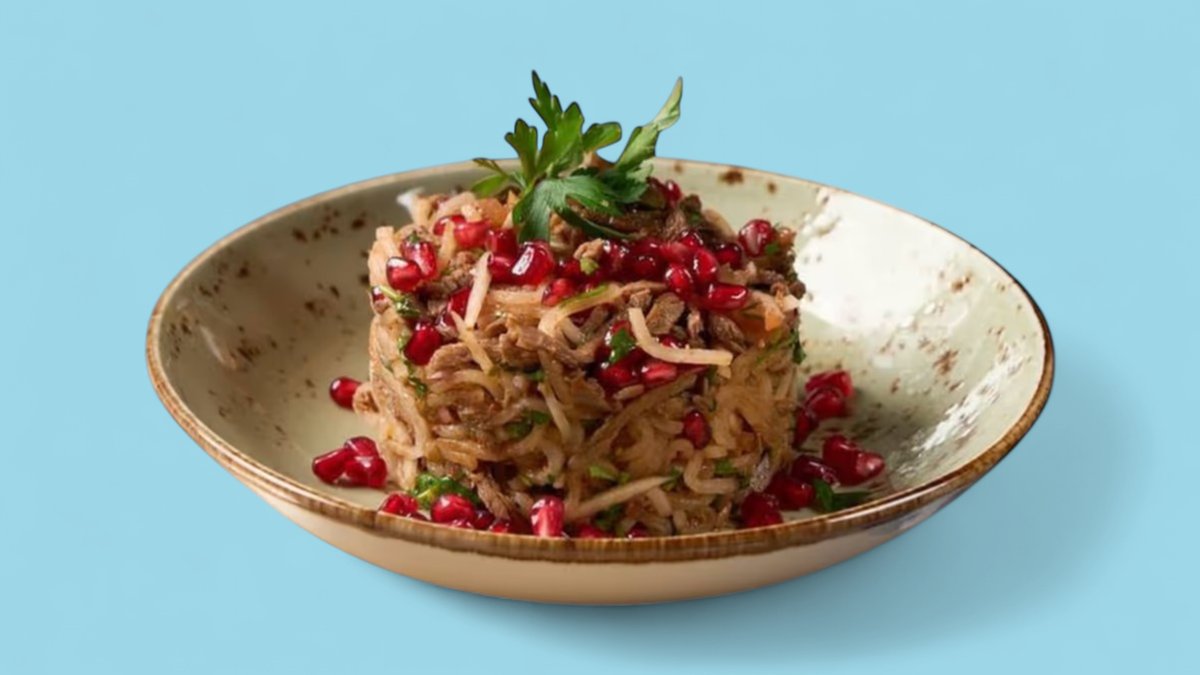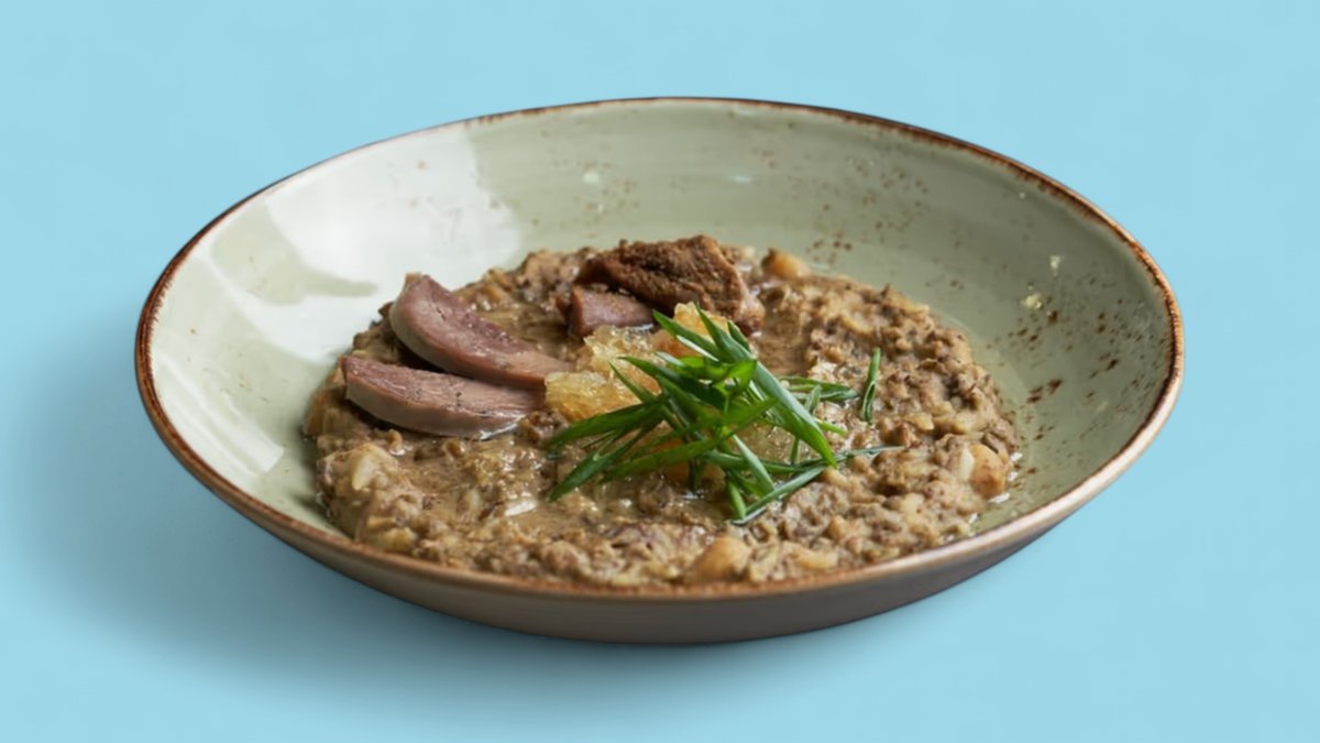 350гр Ржаной хлеб, овощная салься, лук шалот, панировочные сухари, зеленый лук, костный мозг в оргинальной подаче