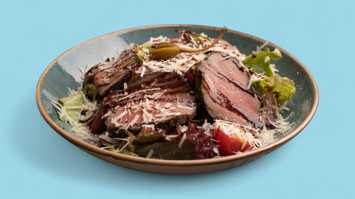 250гр Отварной язык, с обжаренными грибами, латук, заправленный домашним майонезом и пармезаном