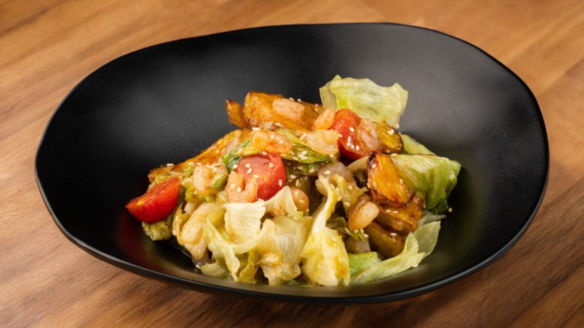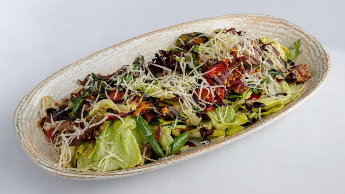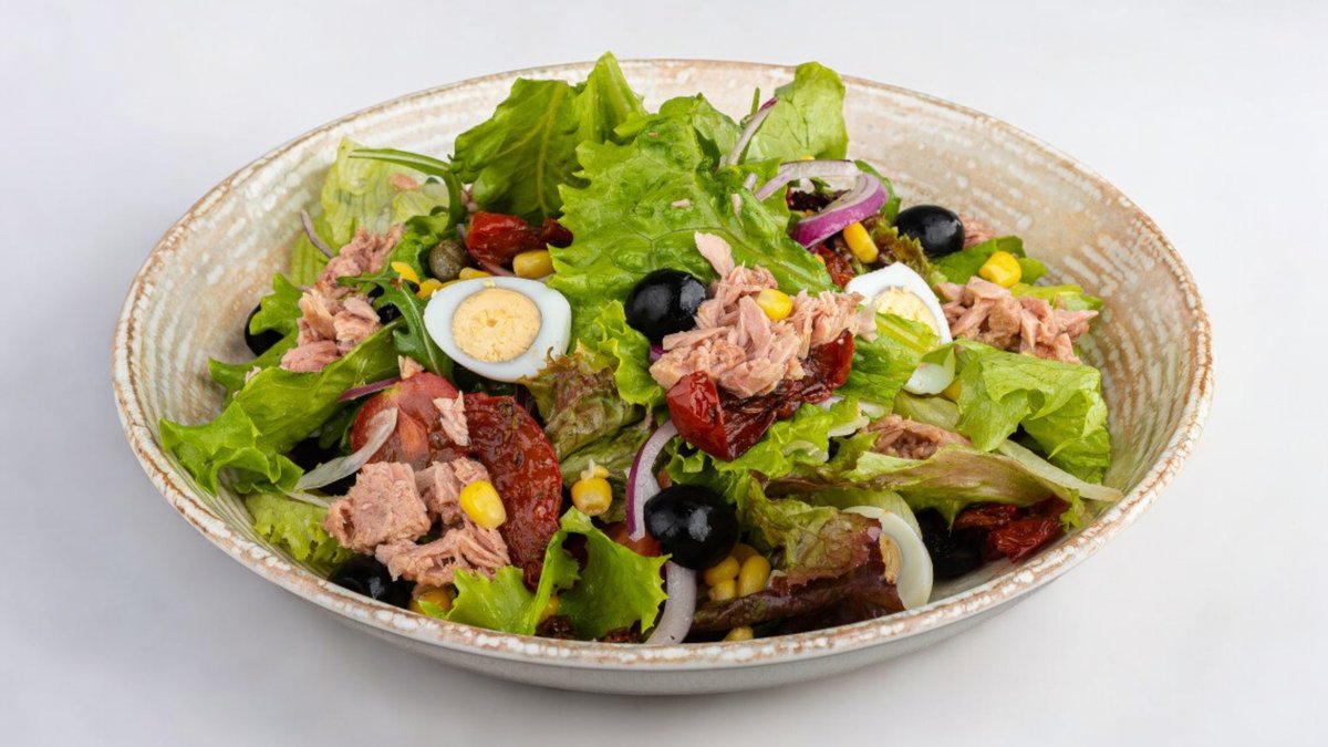 300г Омлет, лук, стручковая фасоль, вяленые помидоры, сыр, красная рыба, микс салат