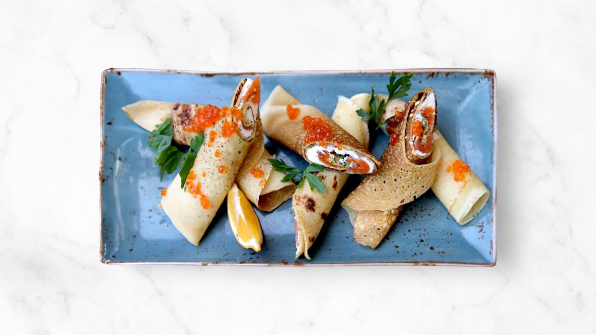 250г Блины, творожный сыр, укроп, красная рыба (слабосолёная)