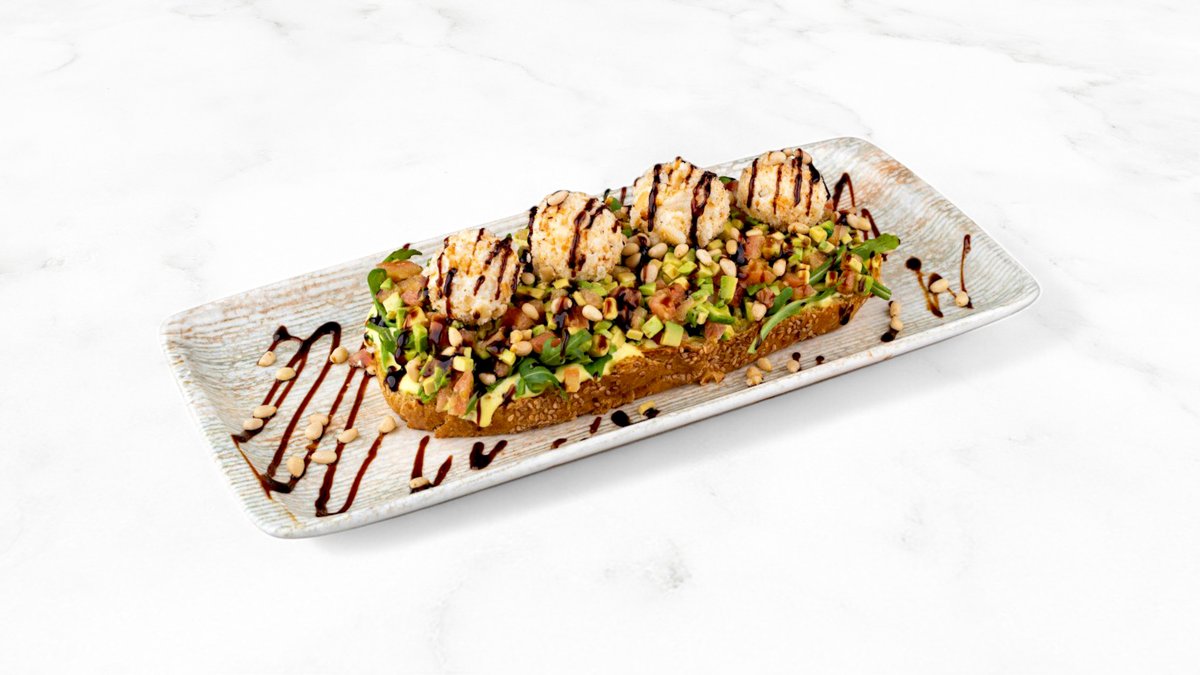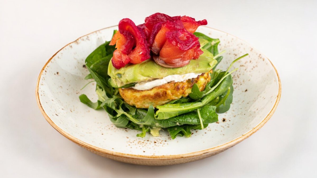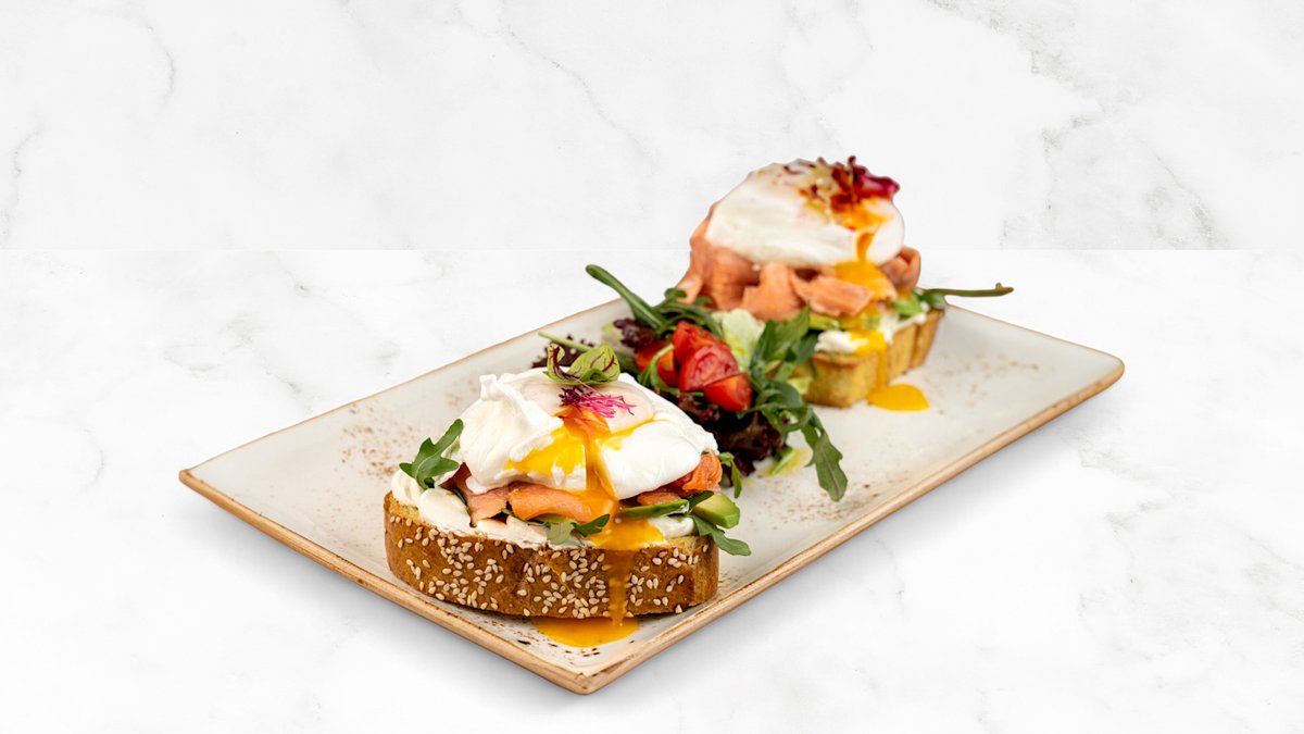 300г Шпинатные тосты, творожный сыр, красная рыбка (слабосолёная), авокадо, руккола, яйцо пашот