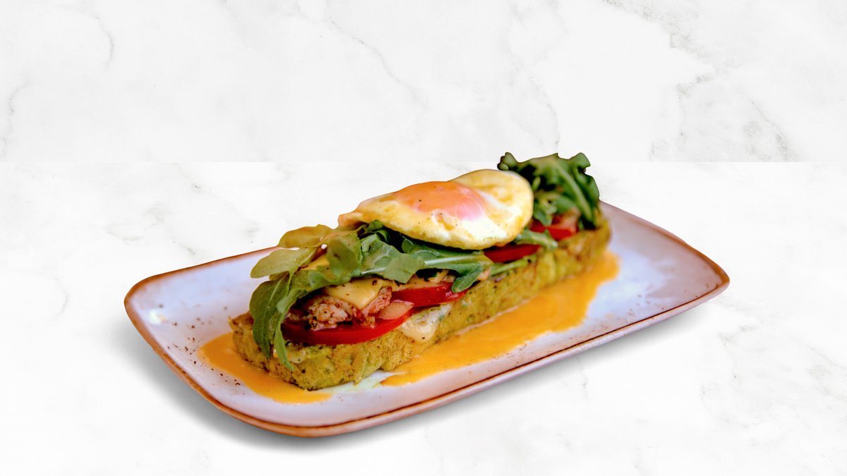 300г Шпинатный тост, соус Алио-олио, помидоры, сыр хохланд, руккола, яйцо