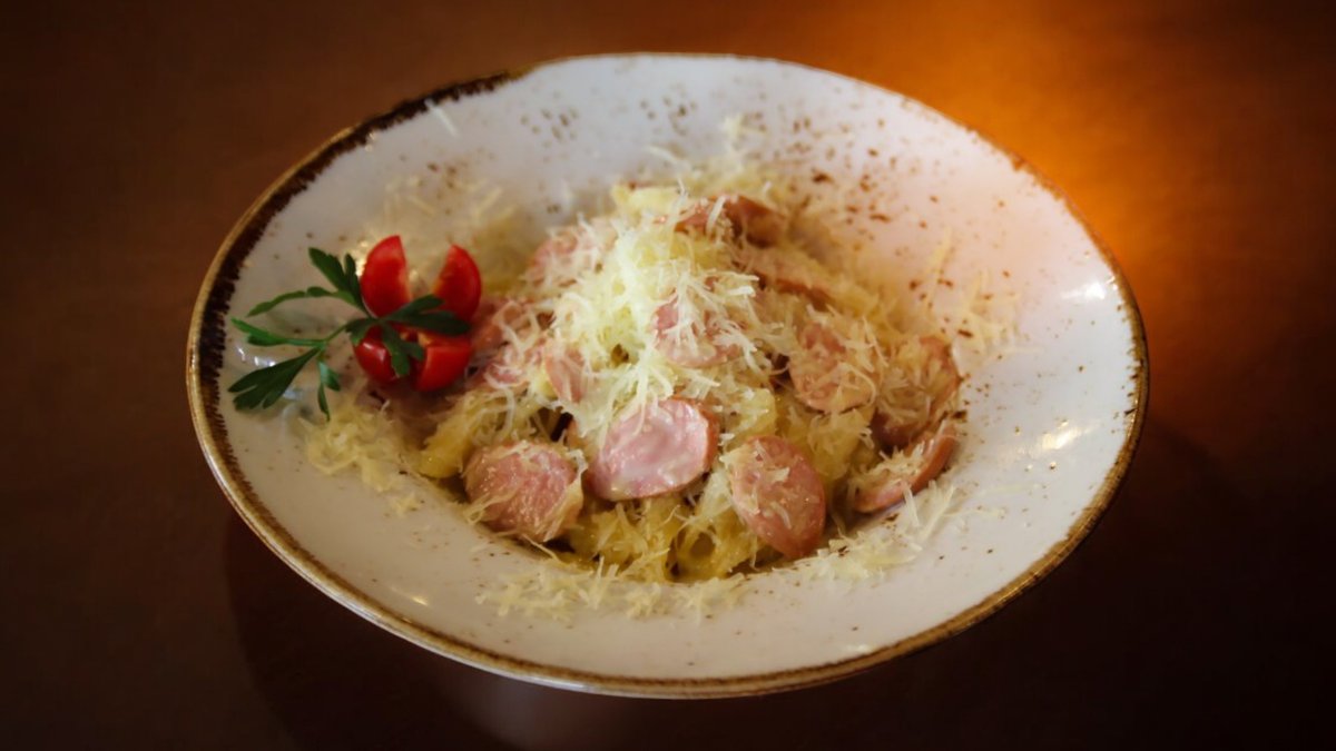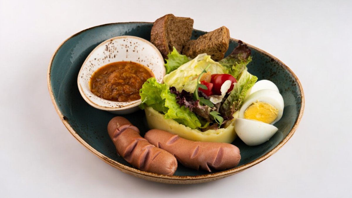 250г Молочные сосиски, кабачковая икра, яйцо, микс салат, тосты, пюре