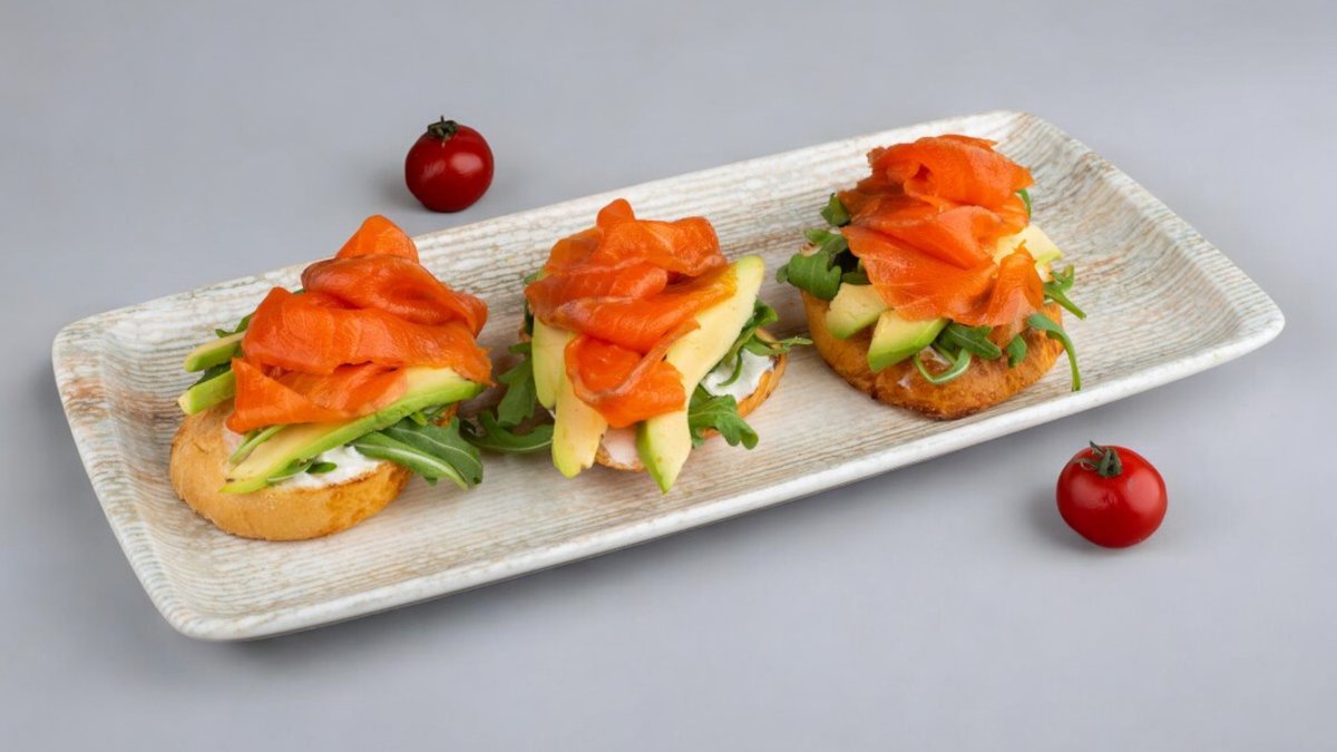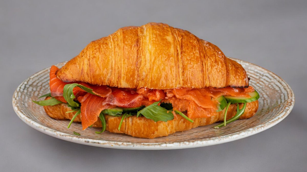 300г Круассан, творожный сыр, огурцы, руккола, красная рыба, яйцо пашот