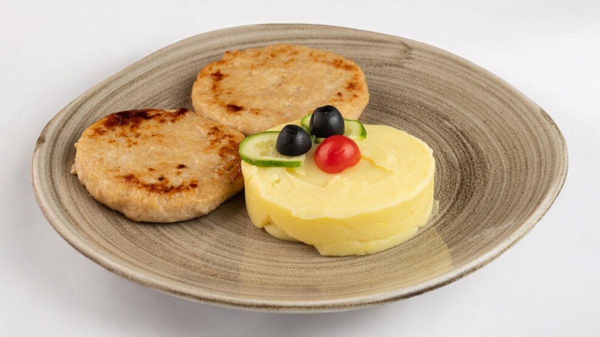 Котлеты из куриного мяса, отварной рис, оливки